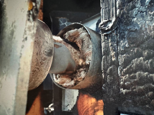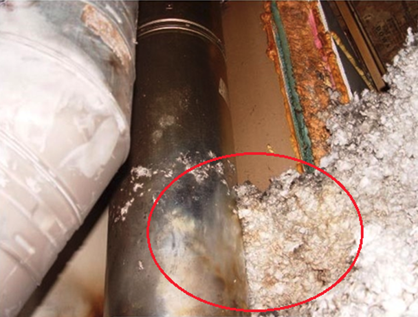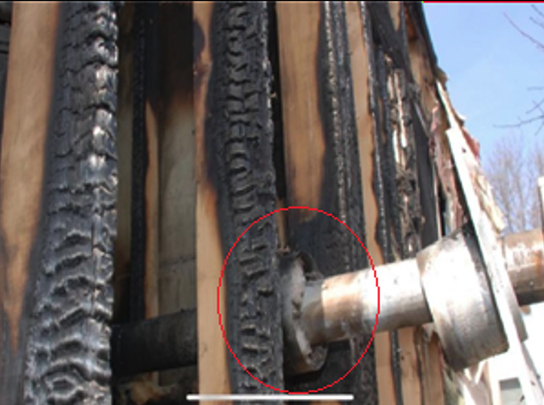 In another heating-related fire, a contractor installed chopped fiberglass insulation, stating to MCA that its placement was acceptable because it was “non-combustible.” Note the thermal patterns on the exterior of the pipe in the photograph below, visible within the circle. Similar to the previous photographs, these patterns show elevated temperatures that compromise the required clearance and allow conductive heating, creating a significant fire hazard.