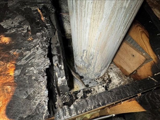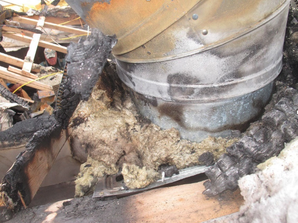 The photographs below show a multimillion-dollar home that was a total loss after insulation came into contact with the chimney flue pipe.