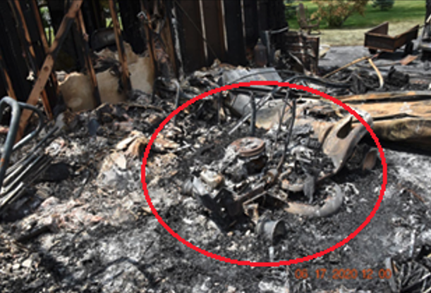 Candles can create a pleasant atmosphere, but their use carries real risk. By following these simple precautions, homeowners can significantly reduce the likelihood of injury, property damage, or a tragic fire. f. Utility and Heavy Equipment MCA investigated 96 fires classified as related to utility- or heavy-equipment. Approximately 66% of these occurred in Wisconsin’s northeastern and northwestern regions, where logging, brush cutting, and other heavy-equipment operations are common. These incidents also involve residential and utility equipment, such as lawn mowers, riding tractors, snowblowers, and utility vehicles. The combination of mechanical systems, combustible fuels, and outdoor environments creates conditions where ignition can occur if proper precautions are not followed. Common contributing factors include overheating engines, fuel or hydraulic leaks, electrical system failures, and debris build-up. Fires can spread rapidly in areas with dry grass, brush, mulch, or accumulated debris, particularly during periods of low moisture. Residential equipment, such as lawnmowers or riding tractors, can ignite fires when combustible materials, such as grass clippings or leaves, accumulate near hot engine components or exhaust systems. MCA has examined several homes that sustained severe damage due to use of riding lawnmowers. In most cases, the fires were caused by dry vegetation accumulating on the mower deck and within the engine compartment. A critical factor in these incidents was that the mowers were parked inside garages immediately after use. For a short period following the operation, the engine remains at its highest temperature. Equipment should be allowed to cool and remain parked away from combustible materials for at least ten minutes before being placed in a garage or shed. Homeowners should routinely clear equipment decks, cutting blades, and surrounding areas of debris and combustible materials. Fire extinguishing equipment should be readily accessible. By following these precautions, the risk of fire associated with utility and heavy equipment can be significantly reduced. The incident shown in the photographs below involved a witnessed fire that originated at the riding lawnmower shortly after it was parked inside the garage. The mower had been operated for more than two hours in tall, dry grass and was driven directly into the garage after use. The photographs illustrate the extensive damage caused by this otherwise preventable mistake.