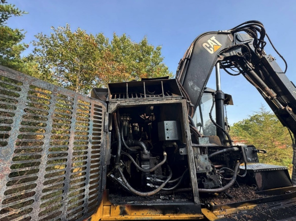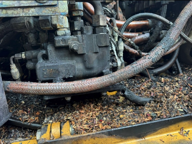 MCA found that a significant number of heavy-equipment fires involving logging and farming machinery were attributable to inadequate maintenance and the accumulation of dry vegetation contacting the exhaust system. Many of these fires originated in the exhaust, particularly on equipment with horizontal exhaust configurations, where wood chips and other debris can readily accumulate. While production demands are understandable, the lack of routine cleaning within the engine compartment remains a leading cause of heavy-equipment fires. Preventive measures are essential for both industrial and residential equipment. Regular maintenance, including inspection of fuel lines, electrical wiring, hydraulic hoses, and engine components, can substantially reduce the risk of failure. Cleaning the exhaust system and surrounding areas is critical for fire prevention. Although stopping production to clean equipment during a shift may seem counterproductive for farmers and loggers, practical solutions exist. Based on field experience, keeping a small leaf blower readily available and taking breaks to inspect and clean the engine compartment, particularly near the exhaust, is an effective and reasonable preventive practice. In the photographs below, the logging harvester experienced a fire in the engine compartment due to inadequate maintenance. In the second photograph, a large accumulation of wood chips and debris is visible.