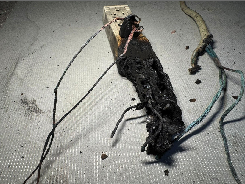 iii. Extension Cords and RPTs One of the most common errors associated with extension cord use is its application as a substitute for permanent wiring rather than for temporary purposes. Extension cords are designed for short-term use and should be unplugged when not actively in service. While their convenience is widely recognized, prolonged or improper use has been associated with significant property damage. Extension cords must be properly matched to the electrical load of the appliance or power tool being supplied. Standard residential branch circuits typically utilize 12 or 14-gauge conductors. When an extension cord with a smaller-gauge conductor is used, it can become overloaded, resulting in excessive internal heating and an increased risk of fire. In these situations, circuit protection devices designed for fixed 12 or 14-gauge wiring may not detect an overload and may fail to trip before ignition occurs. Improper placement of extension cords further increases fire risk. Cords that are coiled, pinched, or routed beneath rugs, furniture, or shelving can sustain physical damage and restrict normal heat dissipation associated with current flow. This restriction can lead to localized heat buildup and eventual failure of the cord insulation. RPTs, commonly known as power strips or surge protectors, raise similar concerns. Although convenient, they are frequently overloaded and misused. RPTs are not intended for permanent installation and should be de-energized when not in use. Improper or continuous use significantly increases the likelihood of overheating and fire.